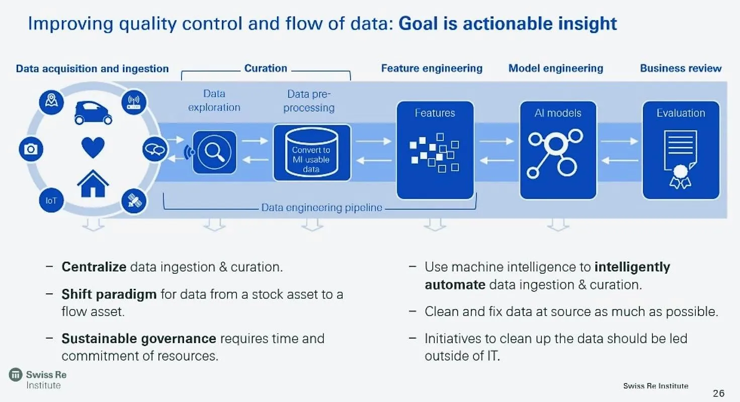 По словам Джеффри Бонна, директора по исследованиям и инновациям Swiss Re, следует изменить наше представление о данных. До сих пор данные считаются чуть ли не чем-то статичным, набором или озером. Впрочем, данные – это нечто непрерывное, постоянно движущееся и меняющееся. Джефф предпочитает термин data river (дата-река), вместо data lake (дата-озеро). Аналитика исторических данных играет важную роль, и уже сейчас нужно целиться, чтобы достичь возможности анализировать данные если и не в режиме реального времени, то хотя бы максимально свежие.