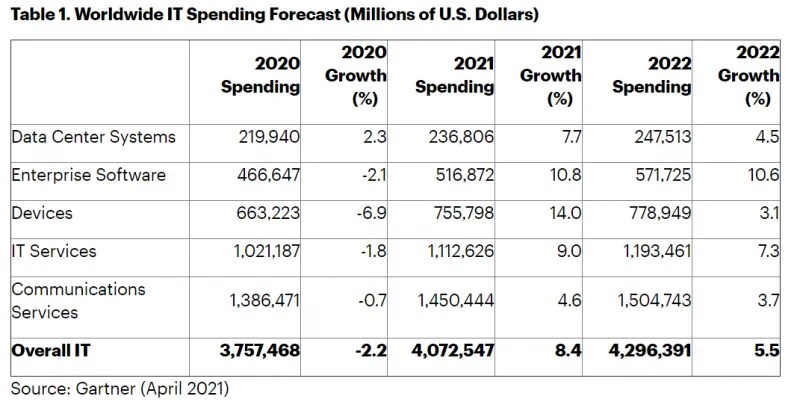 В этом году будут расти все основные сегменты IТ-расходов. Например, затраты на устройства вырастут на 14 процентов, а на программное обеспечение – на 10,8 процента. Рост здесь объясняется тем, что компании сейчас сосредоточены на обеспечении комфортной, инновационной и продуктивной удаленной рабочей среды для своих работников.