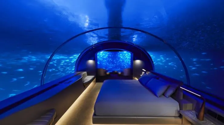 На курорте Conrad Maldives Rangali Island есть "частный аквариум". Это номер, который расположен под водой на глубине 5 метров. Верхняя часть комнаты изготовлена из прозрачного материала.