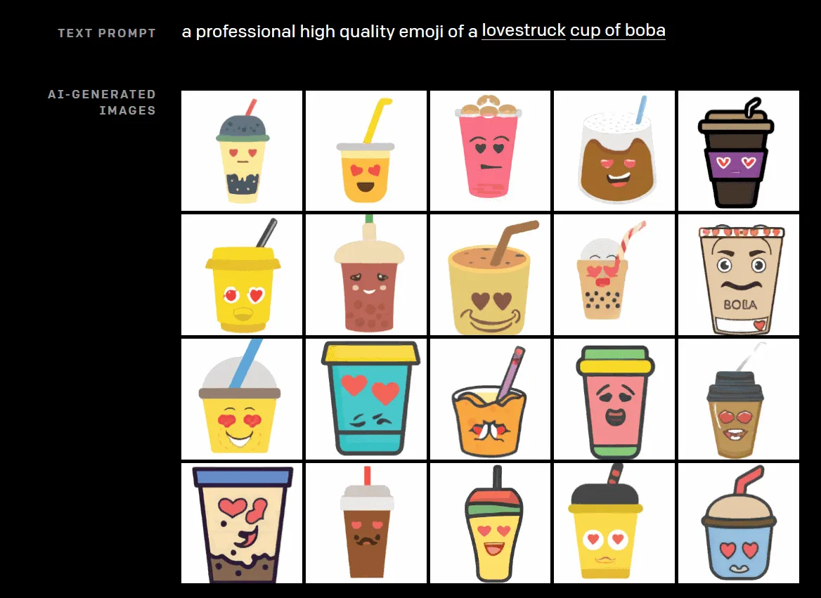 - Программа создала иллюстрации по следующим ключевым словам: "профессиональный высококачественный эмодзи влюбленного стакана бабл-ти".